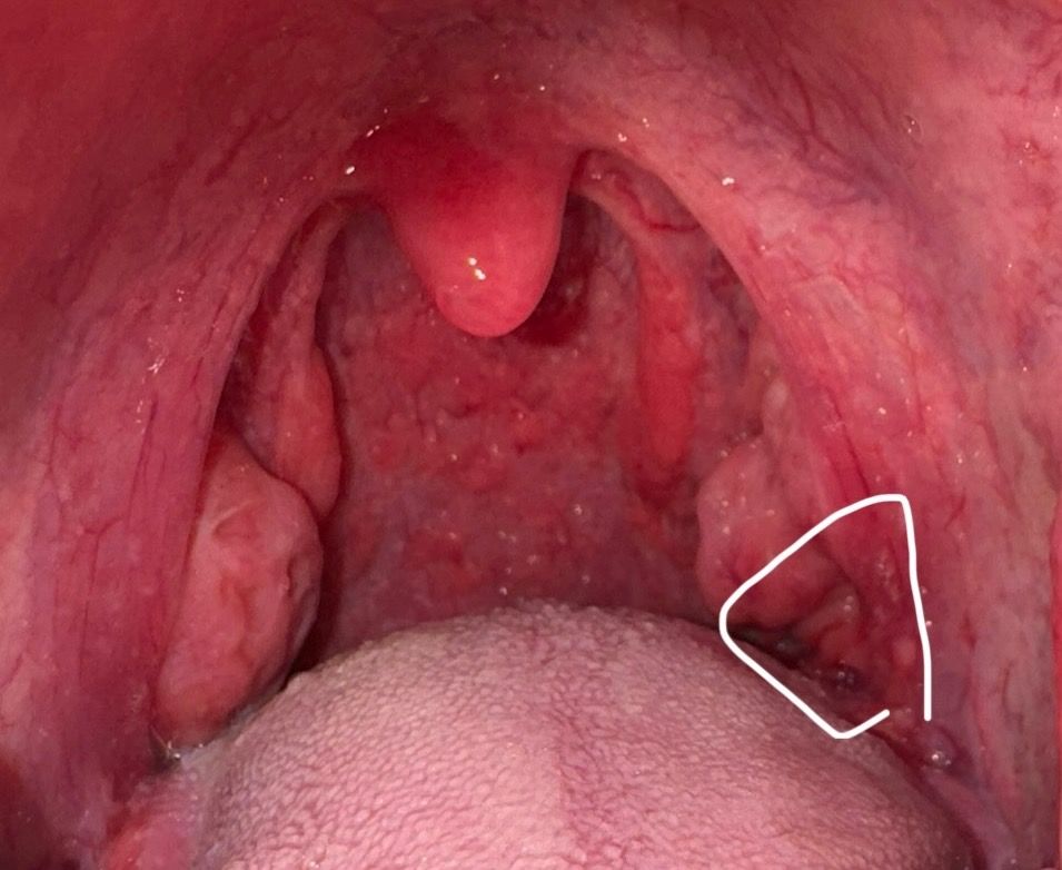 동그라미친 부분이 오른쪽엔 없고 왼쪽에만 있어서 만져봤는데 만지고 침을 뱉으니까 피가 좀 섞여 나오는데 암인지 궁금합니다. 편도 좌우 크기도 괜찮은지 궁금합니다