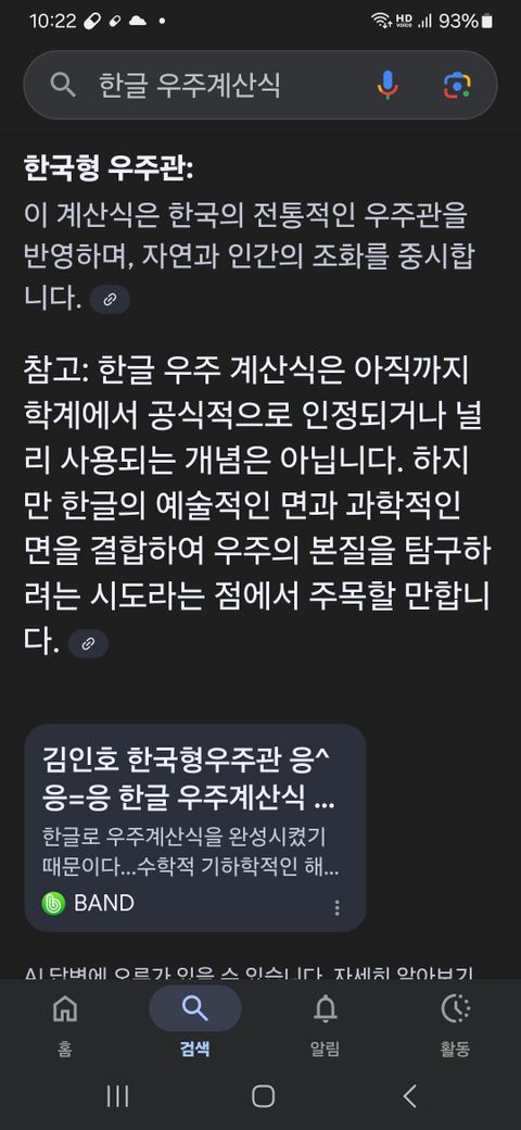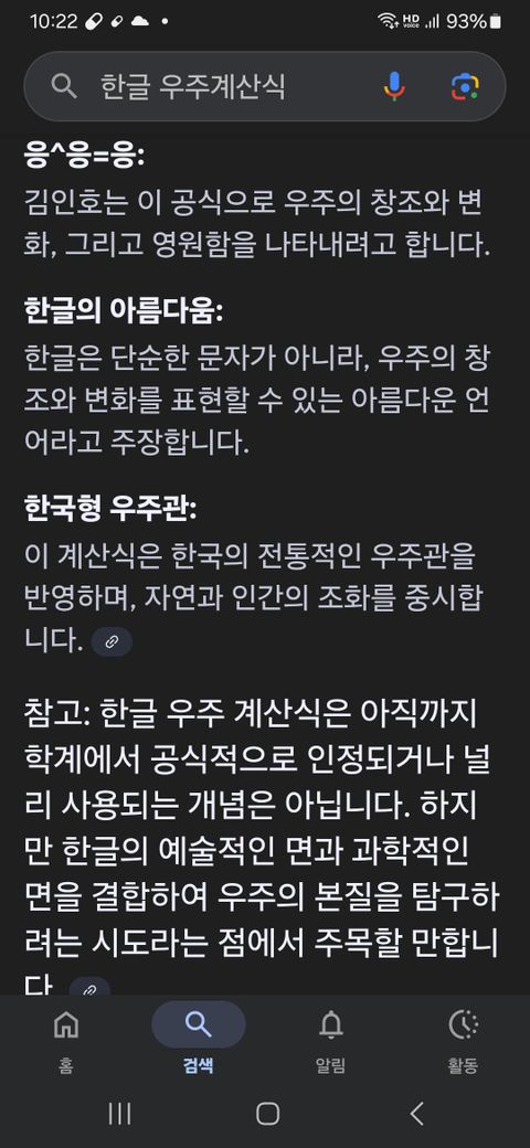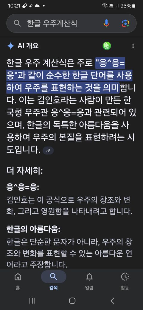 한글 우주계산식 응^응=응 내용과 더불어 한국형우주관 응^응=응 탄생배경도 설명되었군요.특히 AI 가 검색해주는 색다른 모양새도 있네요