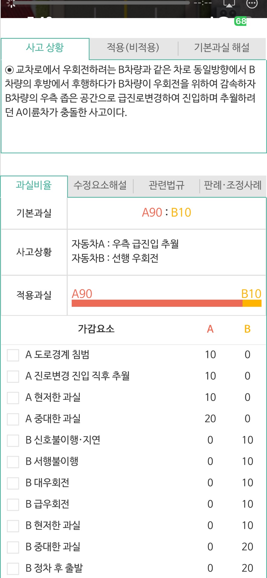 해야 했기에 10%의 과실이 산정되어 오토바이 90 : 10 우회전 차량의 과실이 적용됩니다.
