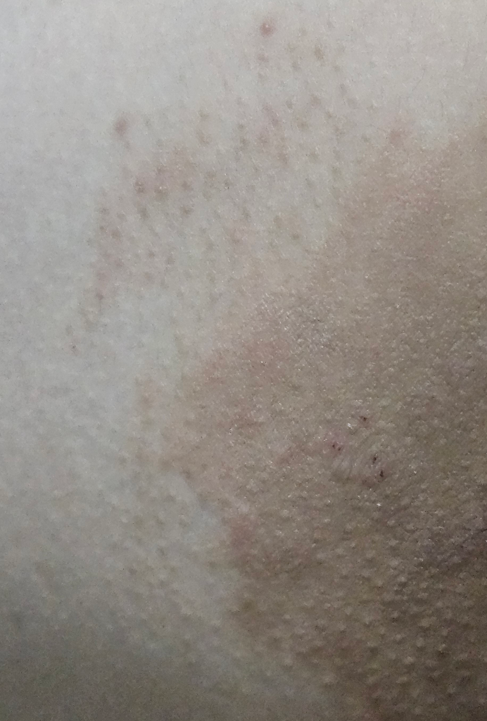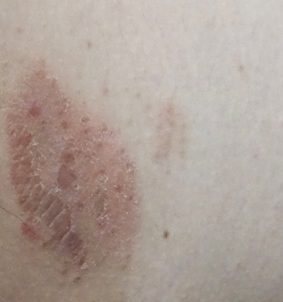 습진성 병변이 보이고, 긁고 마찰될 때 자극받은 피부가 두꺼워진 부분도 보입니다. 피부과에서의 진료가 필요할 것으로 보이니 방문해보시기를 권해드립니다.