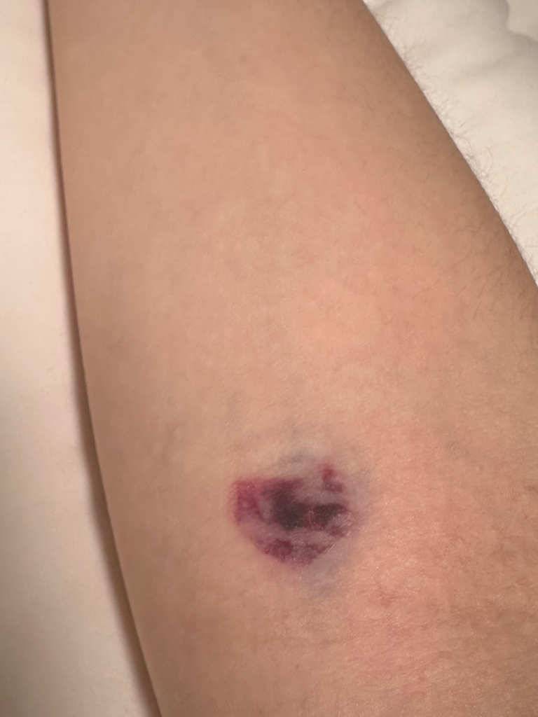 이러한 멍은 주사 바늘로 인해 혈관이 손상되었거나, 주사액이 조직 내로 유출되면서 발생할 수 있습니다. 대부분의 경우 이러한 멍은 심각한 상태가 아니며 며칠 내로 호전되곤 합니다. 통증이 있을 경우, 차가운 찜질을 하거나 온찜질을 하는 것이 도움이 될 수 있습니다.