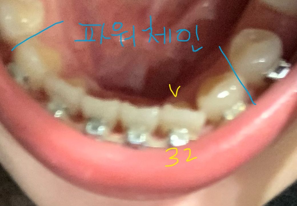 32번만 윗니랑 반대교합이라 돌리면서 넣으려고, 아랫니 33~43 파워체인 건 상태입니다.