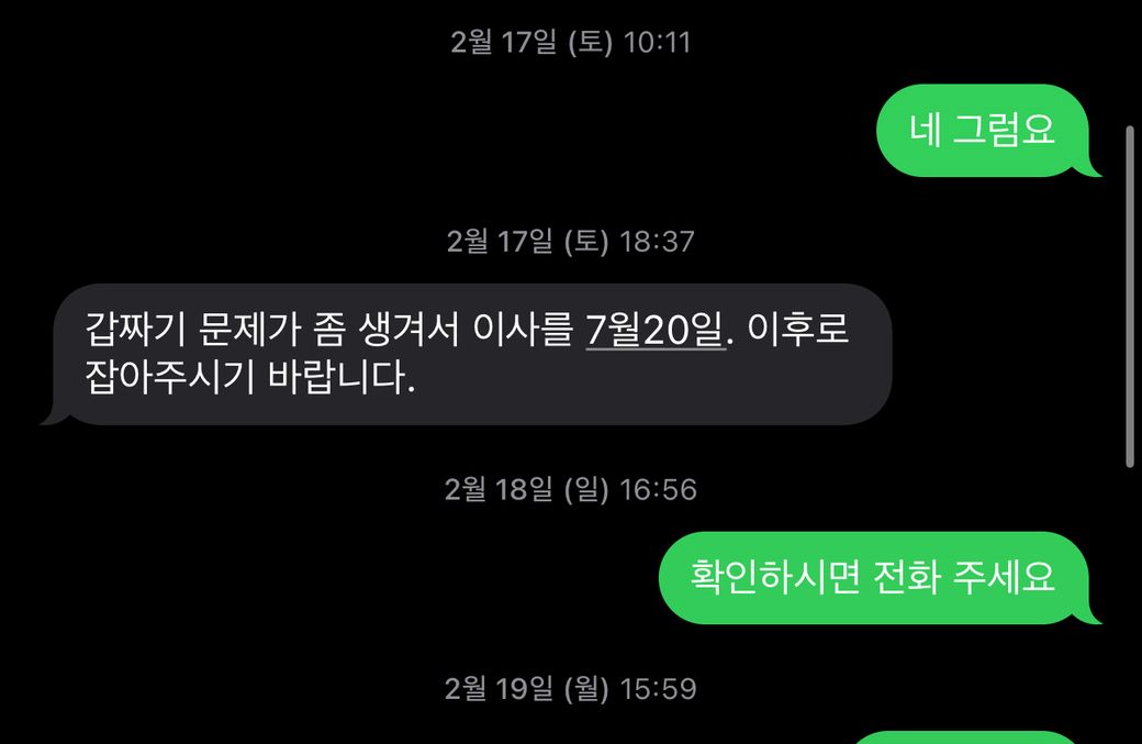 알겠다고 하였고, 24년 2~3월 집을 알아보던 중 계약 만기시점에 보증금을 줄 수 없으니 24년 7월 20일 이후 나가라고 통보하였습니다.