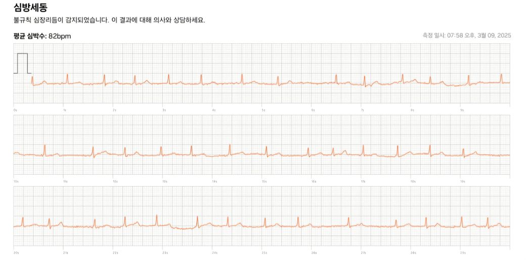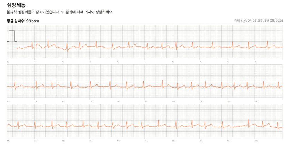 갤럭시워치 심전도는 12개의 lead 중에서 한개의 lead만 나오기 때문에 완벽하게 분석할 수는 없지만 QRS파가 좁게 유지되면서 불규칙한 QRS와 P파가 보이기 때문에 심방세동일 가능성이 높아보입니다.