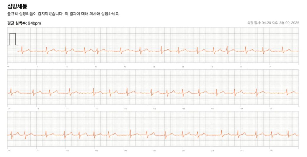심혈관내과 진료가 반드시 필요할 것으로 사료되며, 병원에서 12리드 심전도를 정식으로 검사해보시길 권장합니다.