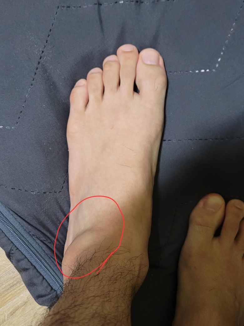 앞공중 돌기를 연습하다가 착지할때 발목에 무리가 갔는지 통증이 느껴지더라구요. 그래서 집와서 보니까 저렇게 붓기가 있는데 인대쪽 문제일 가능성이 높을까요 앞꿈치를 당기면 통증이 느껴집니다.