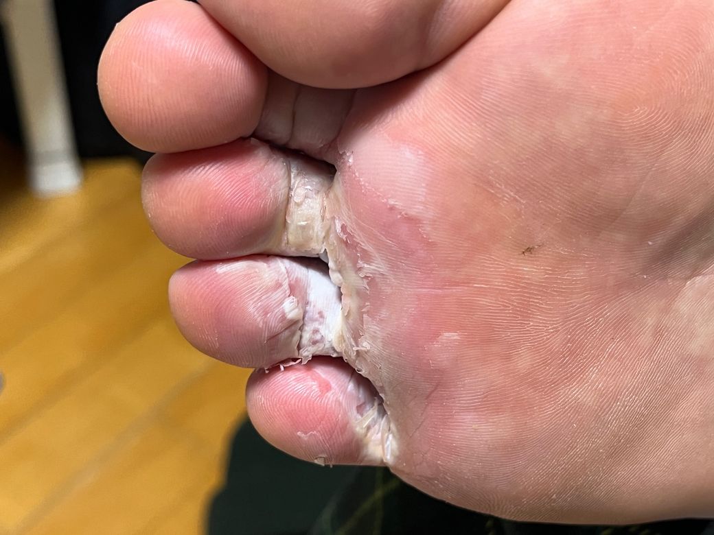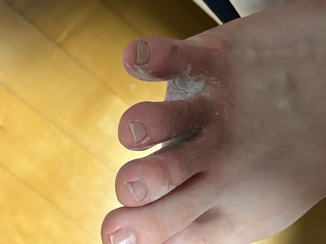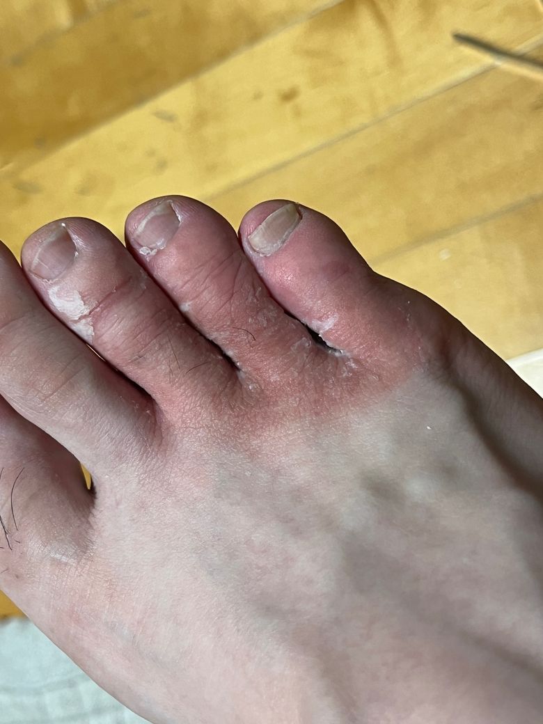 한 2주정도 바르고 있는데 무좀이 낫는 듯 싶더니, 사진처럼 발가락 위의 피부가 다 벗겨졌고 발가락 사이에는 하얗게 껍질이 일어나고 있습니다 ㅠㅠ
