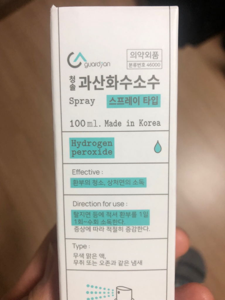 소독이 필요없다는 상처는 굳이 건들지 않는게 안전하지만, 소독하시겠다면 포비돈을 사용하시는 편이 좋겠습니다. 포비돈이 없다면 사진의 과산화수소수를 거즈나 솜에 적셔서 상처를 소독하시면 됩니다. 다만 과산화수소수는 상처의 자극감을 유발할 수 있습니다.