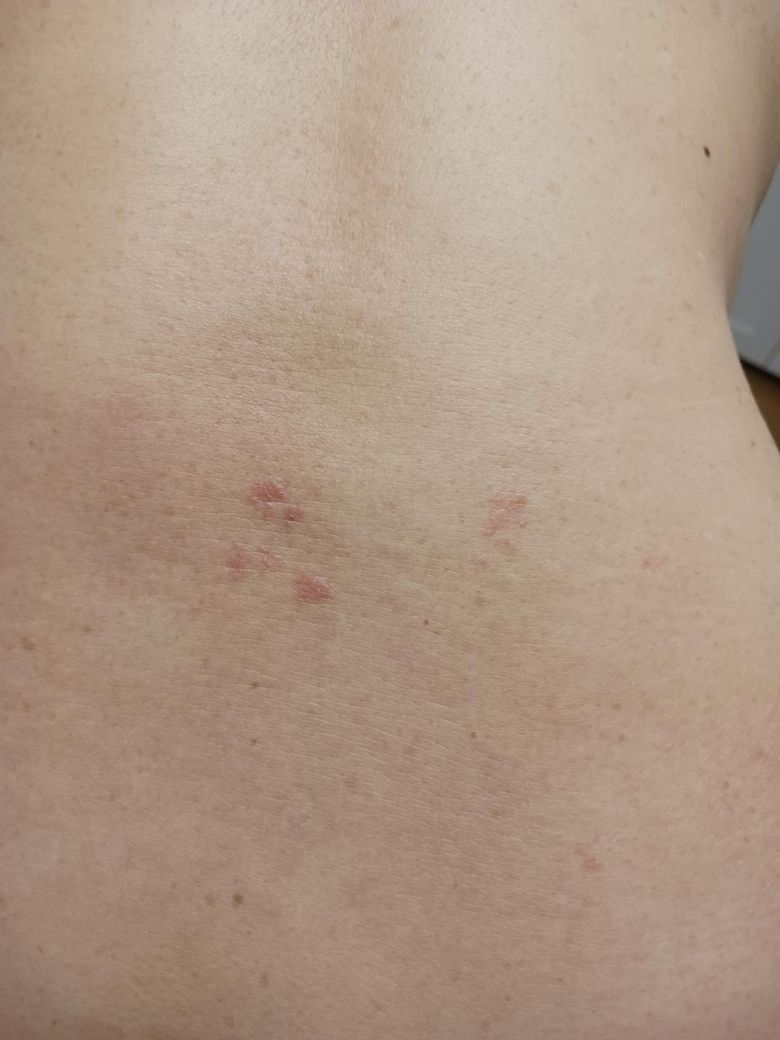 사진으로 정확한 진단은 불가하나 현재 허리 한쪽에 군집 형태의 붉은 발진과 수포가 모여 있는 양상이 관찰됩니다. 이러한 모양은 대상포진(herpes zoster)에서 흔히 나타나는 전형적인 피부 증상과 유사해요. 특히 몸의 한쪽에 국한되어 띠 모양처럼 퍼지며, 통증이나 따가움, 작열감 등을 동반하는 경우가 많죠