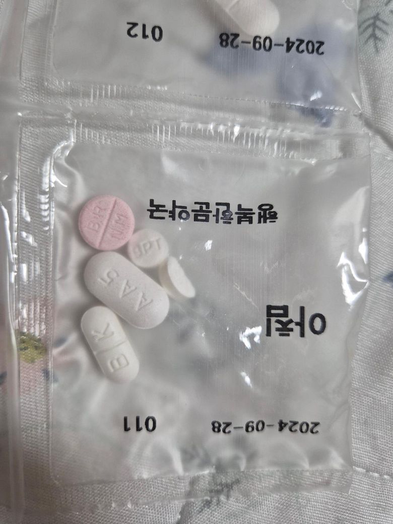 AA5가 적혀있는 하얀색 약물이 진통제입니다. 목이 아픈 경우 드시면 효과가 있습니다.