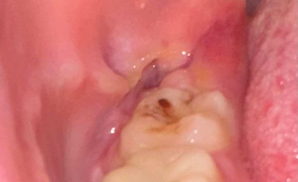 사진으로 봤을 경우에는 어금니 위쪽에 무언가 있어 보입니다. 발치를하고 생긴 조직일 수도 있고 충치일 수도 있습니다. 자세한 확인을 위해 치과에서 진료를 받아보는 것을 권유드립니다