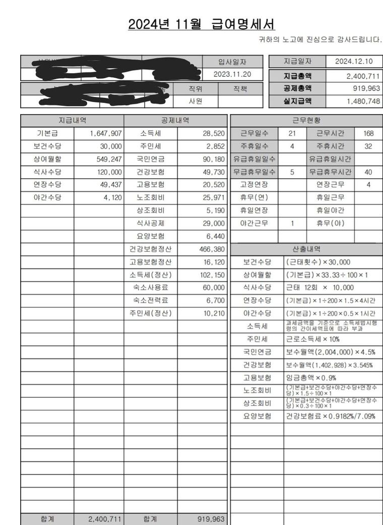 안녕하세요 이번에 11월 말까지 일하고 퇴사를 하였는데 월급이 기본급보다 적게 들어와서요 저랑 같이 근무하던 친구는 8월까지 일하고 그만뒀는데 250만원 정도 들어왔고 저는 기본금 160만원보다 적은 140만원이 들어왔습니다. 급상여명세서를 보면 공제내역에 건강,고용보험 정산, 소득세 정산, 주민세 정산이 더 추가적으로 생겨 월급이 적게 들어온건 이해를 하지만 그렇게 들어가면 100만원이 빠져나가던데 이게 맞는건가요 사회 초년생이다보니 잘 모르겠네요... 원래 마지막 월급은 기존에 들어왔던 월급보다 적게 들어오는게 맞을까요? 급상여명세도 첨부해드릴께요