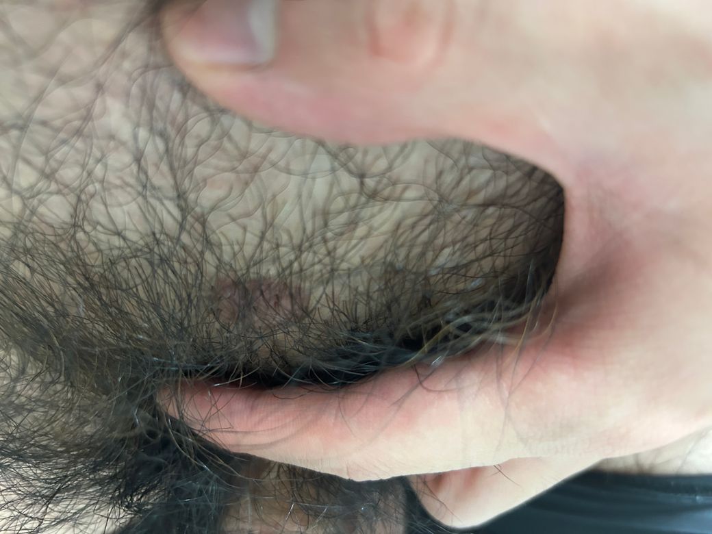 습진 또는 모낭염 등이 의심되지만 간혹 곤지름 등의 가능성도 있기 때문에 지속시는 피부과에 내원하시어 진료를 받아보시는 것을 추천드립니다.