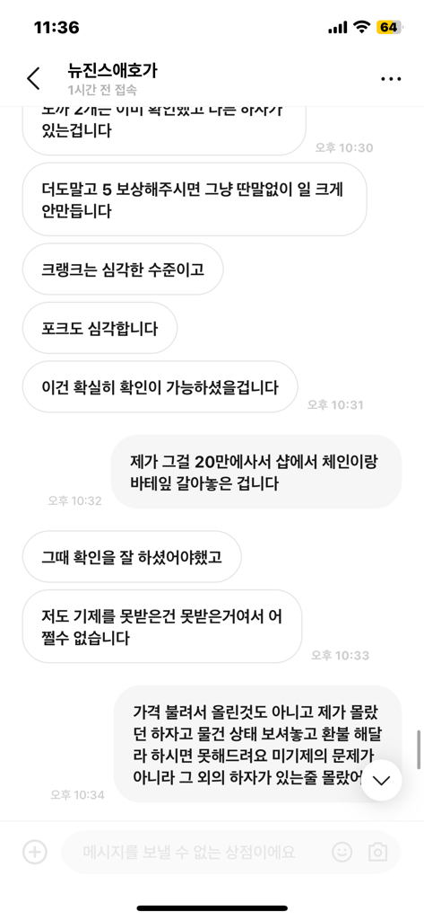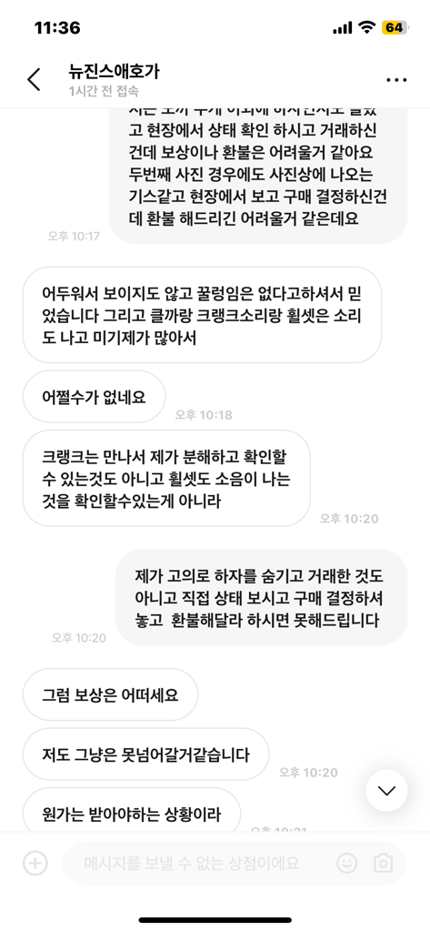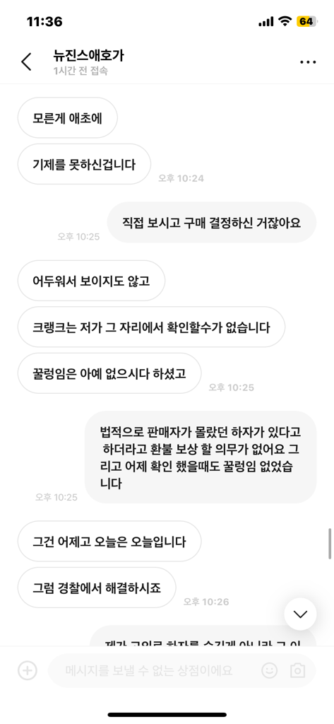 우선, 중고거래에서 하자유무의 문제는 민사문제로 형사고소를 하더라도 경찰서에서 반려할 가능성이 높습니다. 기재된 내용상 상대방이 직거래과정에서 충분히 확인가능했던 하자를 뒤늦게 주장하는 것으로, 상대방이 인지를 하였거나 할 수 있었음에도 이를 제대로 하지 못한 것에 해당하여 환불의무가 있다고 보기 어렵습니다.
