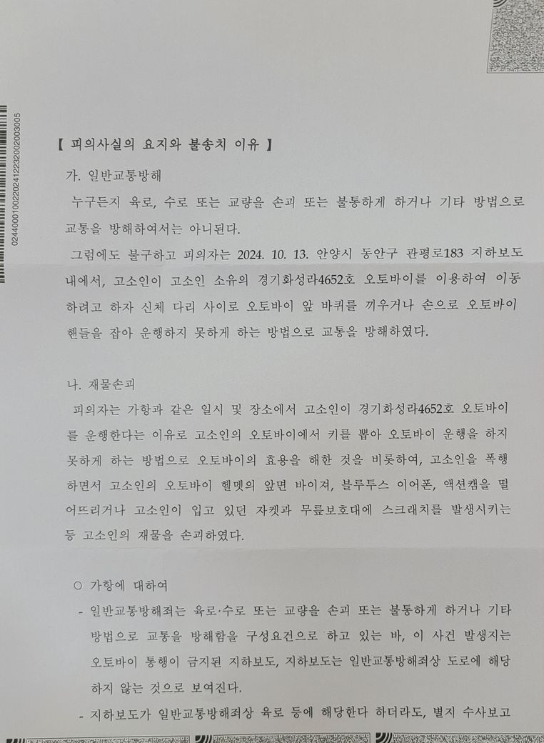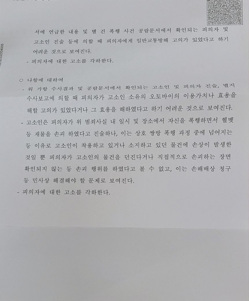 그리고 상대방의 고의적인 행위로 인하여 오토바이가 손괴에 이른 점(위 기재와 같이 과실에 의한 재물손괴는 불가벌입니다)을 각 입증할 수 있는 증거자료를 보강하셔야 할 것입니다.