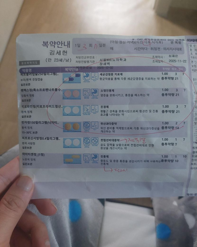 요로결석이 11월에 생겨서 급하게 비뇨기과를 다녀와 약을 복용중인데 오늘 독감 확진이 되어 약을 둘 다 먹어야 하는 상황에 놓였습니다 너무 아파서 제대로 질문을 못하겠어서 사진보고 중복되어 먹으면 안좋은게 있는지 알려주실 수 있을까요?