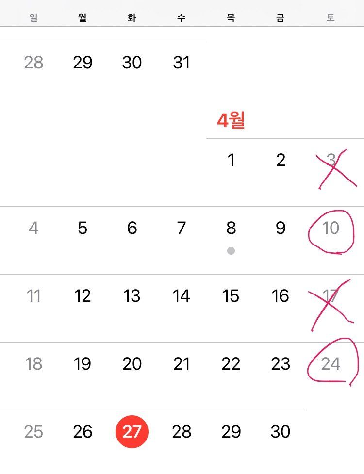 4월3일과 4월 24일 모두 받을 수 있습니다. 다만 마지막 주는 받을 수 없습니다.