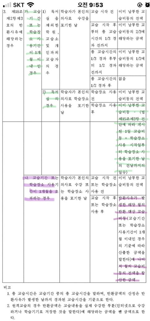 독서실 환불 관련 학원법 시행령 [별표 4]에 대해서 해석 좀 부탁드려요...