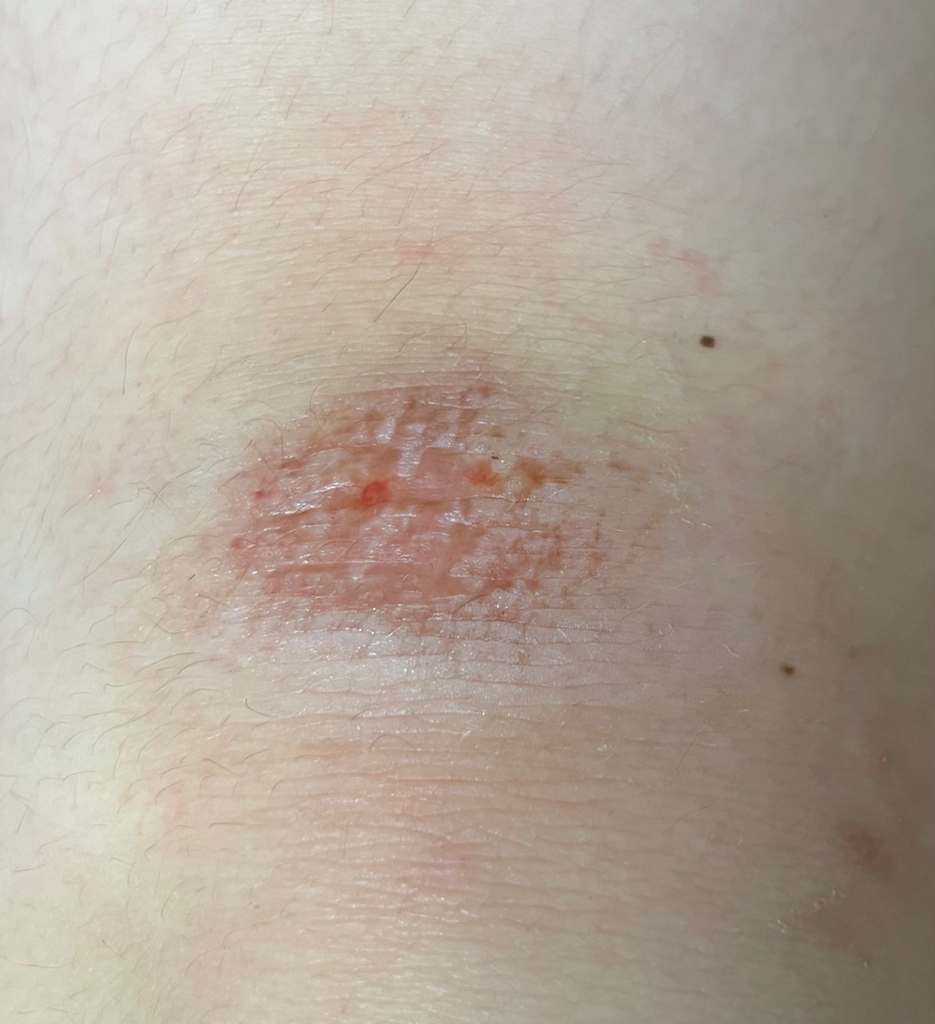 현재 상처 주위로 발적이나 부종은 관찰되지 않고 있습니다. 상처 부위가 회복되면서 화학물질등으로 인해 가려움증이 발생할 수는 있으나 상처 치유 과정중의 일부이므로 자극을 줄경우 2차 세균 감염의 가능성이 있으므로 건드리지 않는 것이 좋습니다.