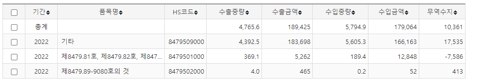 상기 HS code는 산업용로봇이 대부분 분류되는 HS code(8479.50)의 수출입통계를 보여주는 것입니다.