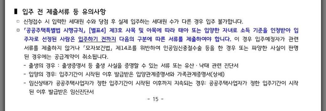 위 사항으로 신청 접수 시 입력한 세대원 수와 당첨후 실제 입주하는 세대원 수가 다른 경우 입주가 불가하다고 적혀 있어