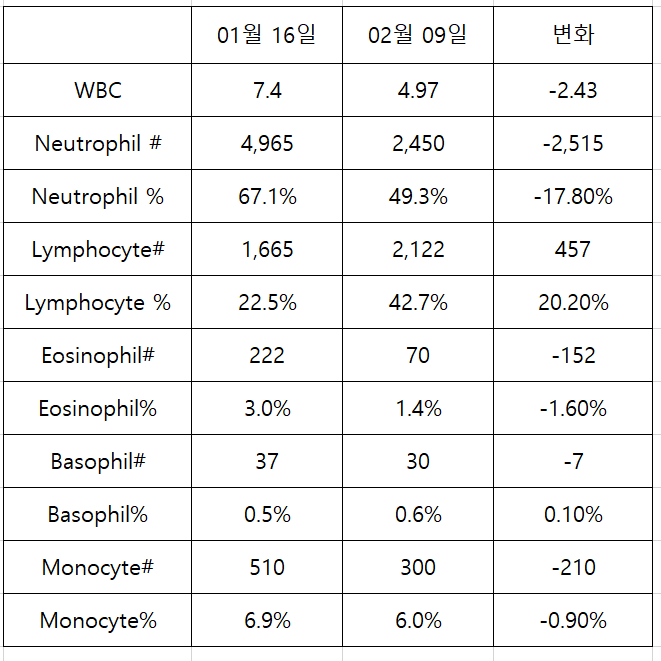 1. WBC가 건강 상태가 정상인 경우에도 3주만에 이렇게 줄어들 수 있나요?