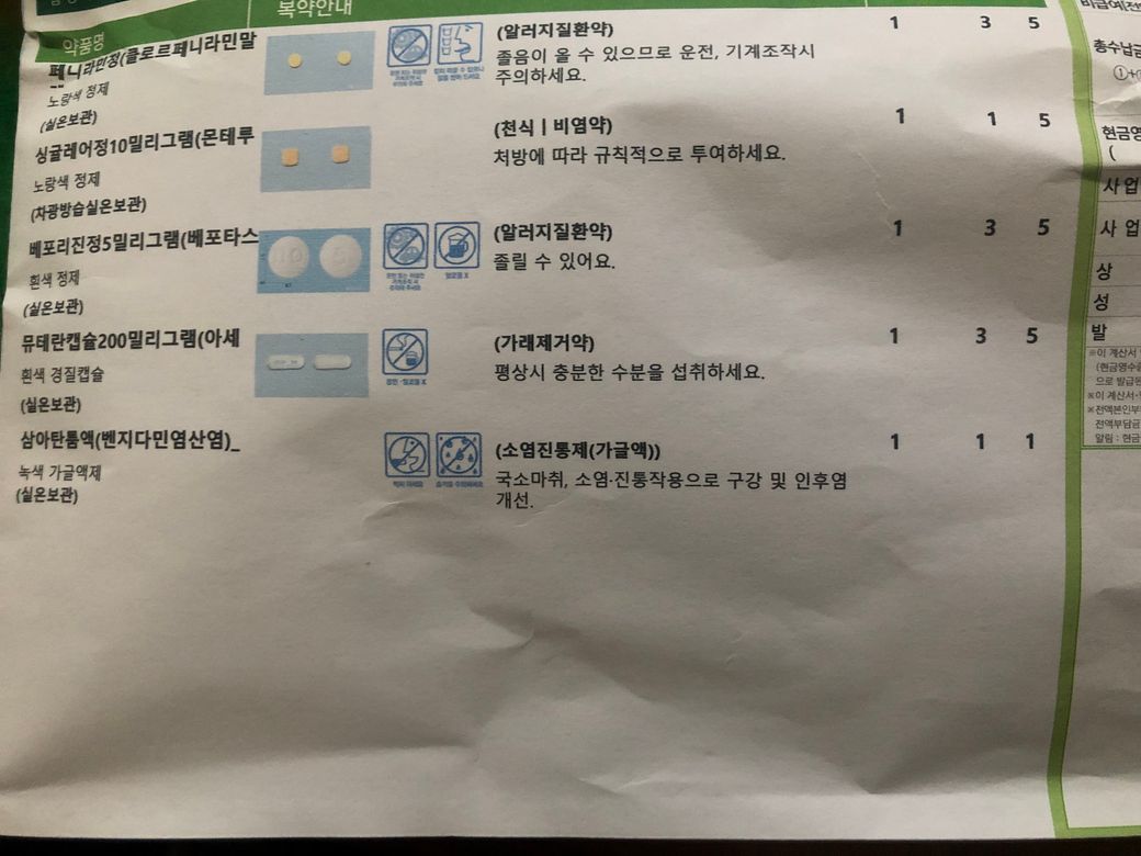 페니라민정 베포리진정5밀리그램 코싹엘정 이렇게 3개다 복용 가능한가요? 아니면 처방받아온 약만 복용해야하나요? 제가 알기론 3개다 항히스타민제로 알고 있는데 혈관운동성 비염이 의심돼서 식사할때나 차가운 뜨거운 온도차이에 따라 콧물이 많이나고 코막힘이 있어서 복용할려고 하는데 페니라민정 베포리진정 코싹엘정 3개다 콧물약으로 알고있는데 베포리진정도 콧물약 맞죠? 코막힘제거약은 코싹엘정에만 있는거로 알고 있는데 정확한 답변 부탁드립니다.