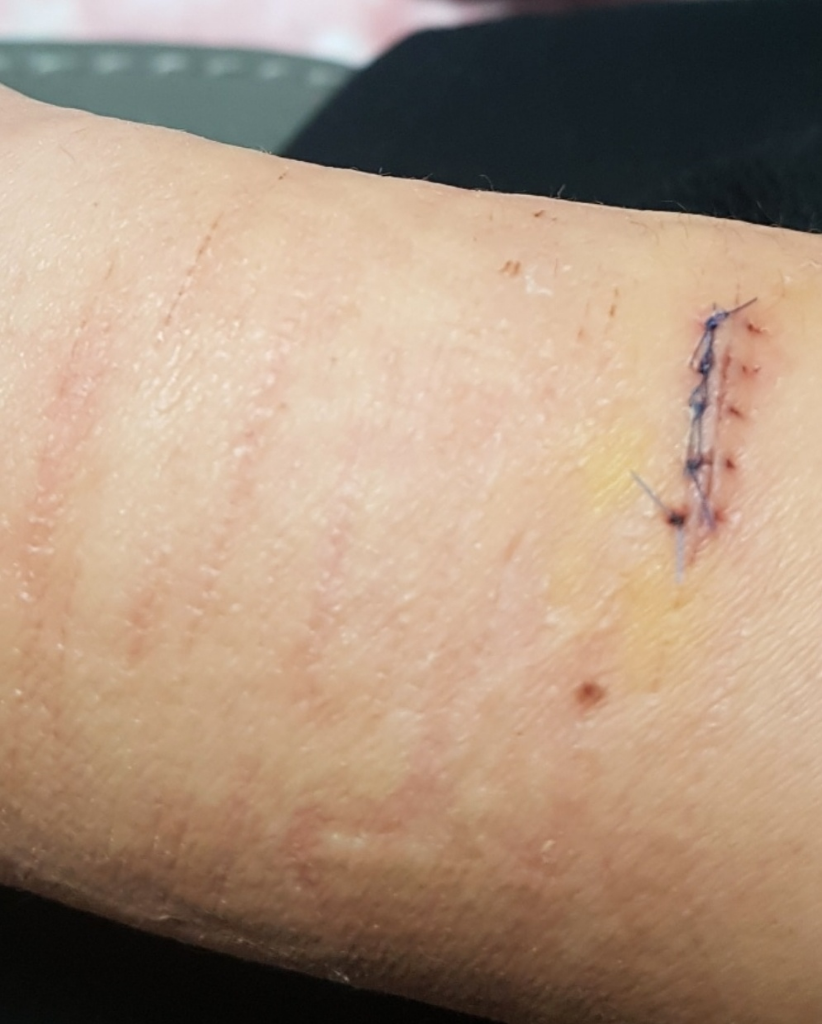 2. 사진을 통해서 추측해볼 수 있는 것은 봉합한 부위 외에도 유사하게 일자 모양의 흉터들이 있는 것으로 보아 자해에 의한 열상으로 봉합을 하였을 가능성이 있어 보입니다. 다만 그냥 추측일 뿐 정확한 것은 주어진 정보로는 알 수 없습니다.