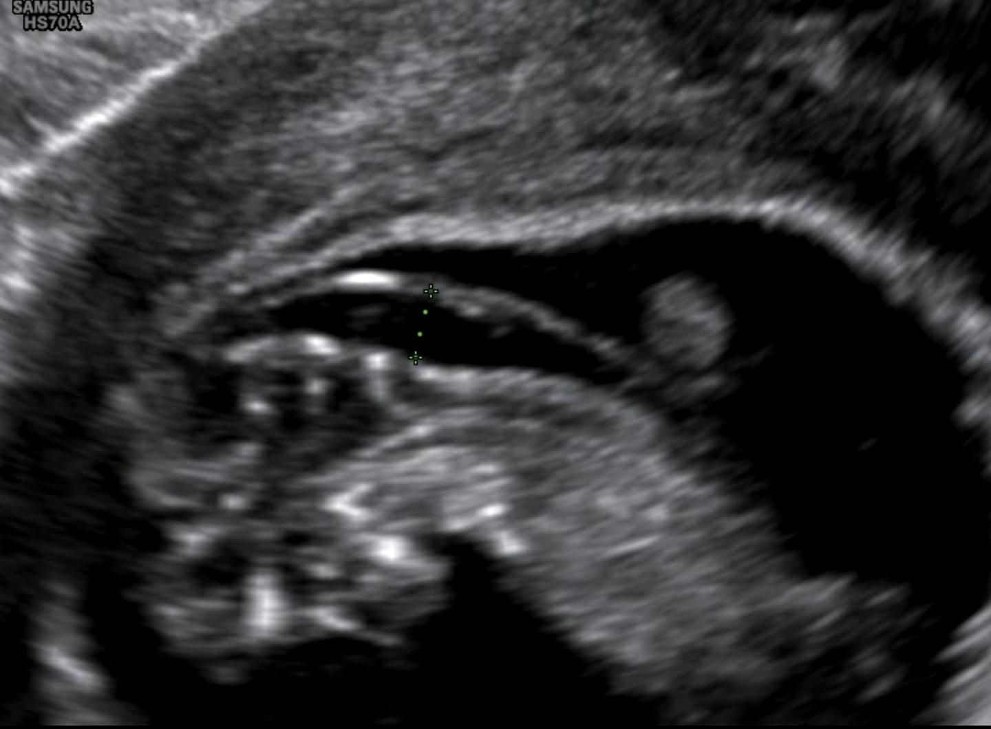 10주 3일차에 측정된 목투명대 3.27mm는 해당 주수 기준으로는 다소 크게 나올 수 있는 수치이긴 하나, 이 시기에는 표준 평가 시점이 아니어서 해석에 상당한 주의가 필요합니다. 목투명대 검사는 일반적으로 11주 0일-13주 6일, CRL 45-84mm 범위에서 태아 머리와 몸통이 정중앙 시상면에 정확히 놓인 상태에서, 목 뒤 투명층을 피부 경계에 거의 수평으로 측정해야 의미가 있습니다. 제공된 초음파는 태아 자세가 완전히 펴져 있지 않고, 측정선이 약간 대각선으로 보이며 정중 시상면이 완벽히 확보됐다고 보기는 어렵습니다. 이런 경우 실제보다 크게 측정되는 일이 흔합니다.