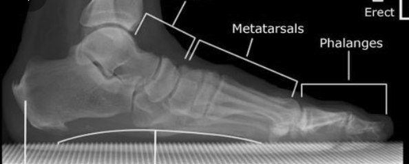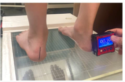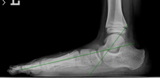 또 다른 방법은 새끼발가락 중족골 및 부분과 종골 밑 부분을 이은 선 사이의 각도가 17도 이하이면 평발입니다.