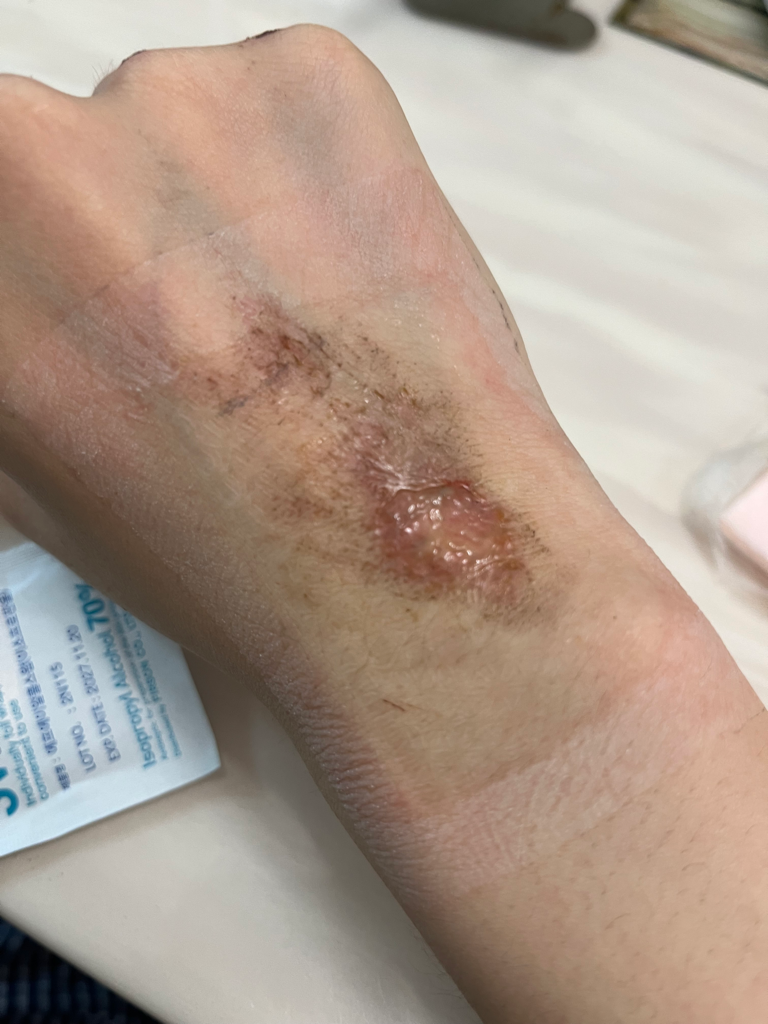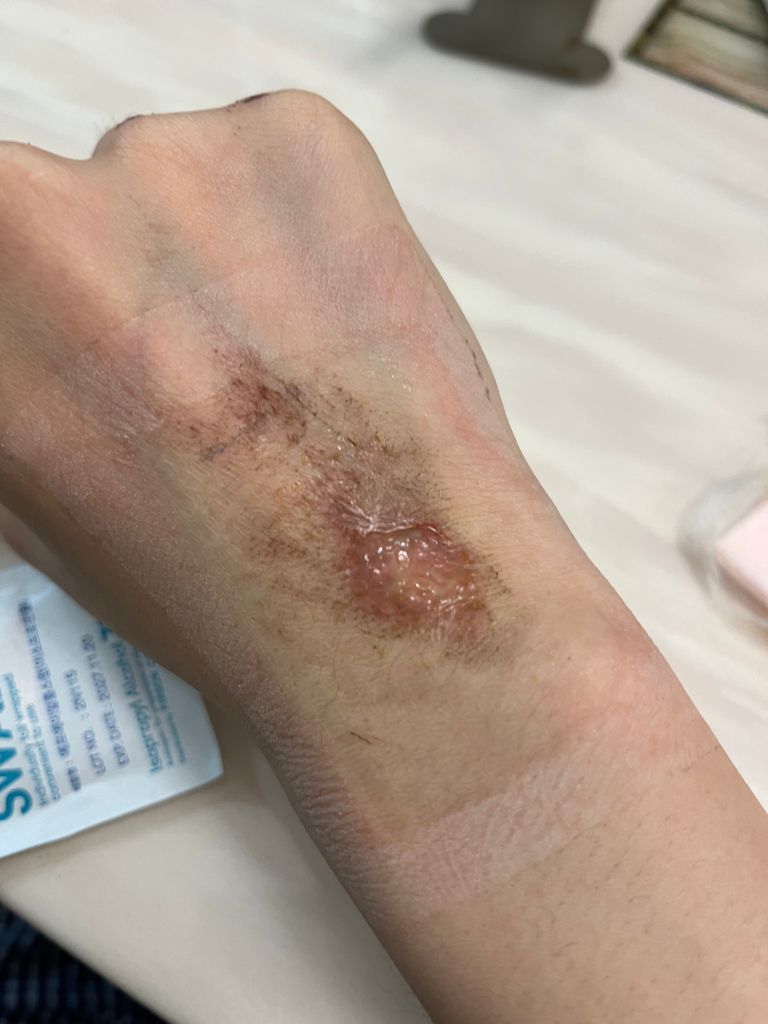 사진으로 볼때는 찰과상이 생겨있고 호전중린양상입니다. 치료에는 적절한 소독과 염증약을 복용한다면 더빨리 호전이될것같습니다ㅡ