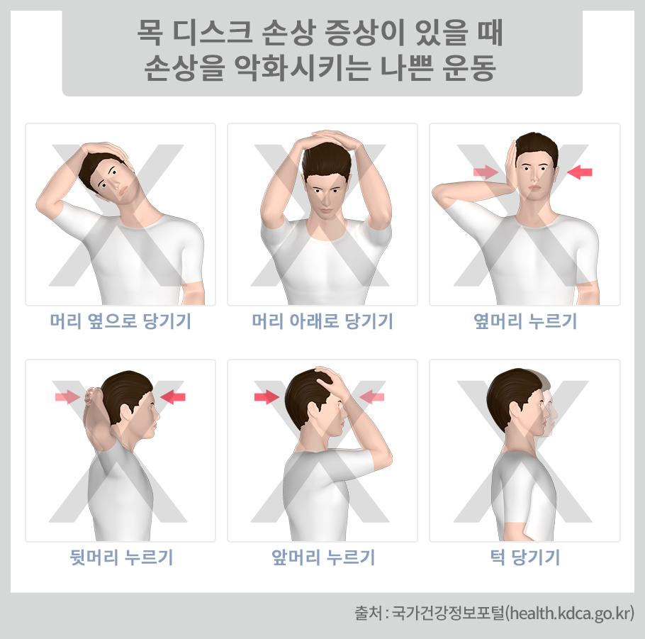 위의 그림은 참고 하시어 조금씩 자세 개선과 일상생활에서 목디스크를 악화 시킬수 있는 것들을 피해주시는 것이 좋겠습니다. 그리고 근력운동을 포함한 안정화 운동을 함께 해주시는 것이 좋겠습니다.