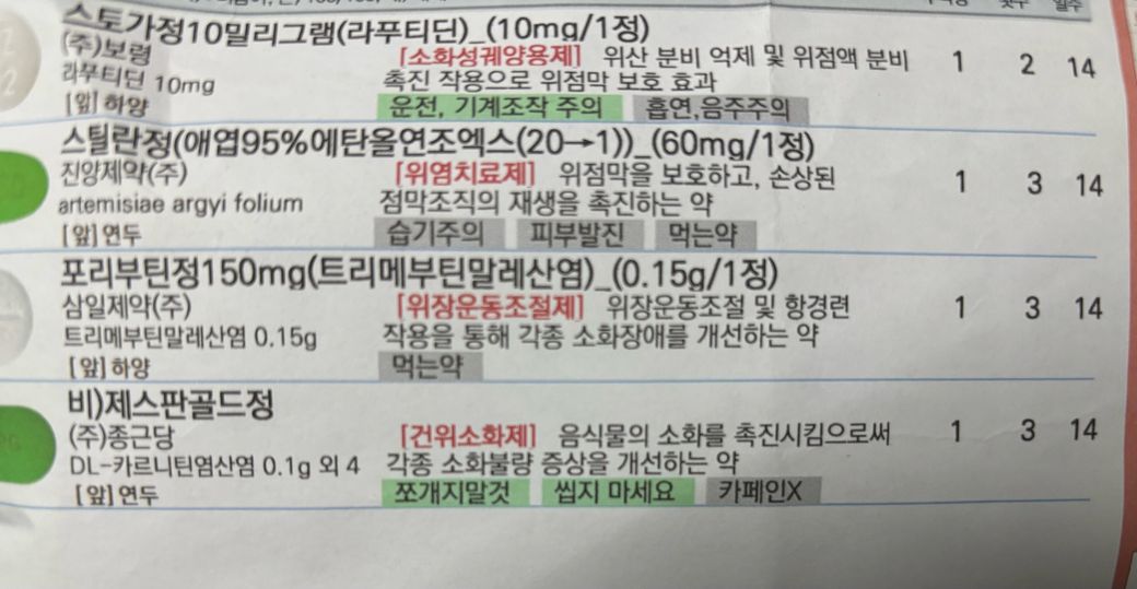 따라서 항생제 세프틸정 250mg과 동아 가스터정 20mg 복용 중 소화불량, 속 답답한 증상이 있으신 경우 사진 속의 약 중 스토가정 10mg을 제와한 나머지 약들을 복용하실 수 있습니다.