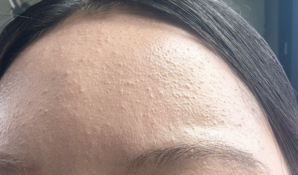 사진상 이마 전반에 균일하게 퍼진 1–2 mm 정도의 피부색 구진들이 관찰되며, 염증성 홍반이나 고름은 거의 없습니다. 형태와 분포를 고려하면 폐쇄면포(좁쌀여드름, comedonal acne) 가능성이 가장 높고, 그 다음으로는 말라세지아 모낭염 가능성이 일부 있습니다. 편평사마귀는 보통 경계가 비교적 또렷하고 납작하며 개별 병변이 약간 더 뚜렷하게 보이는데, 현재 사진 양상은 다소 덜 전형적입니다.