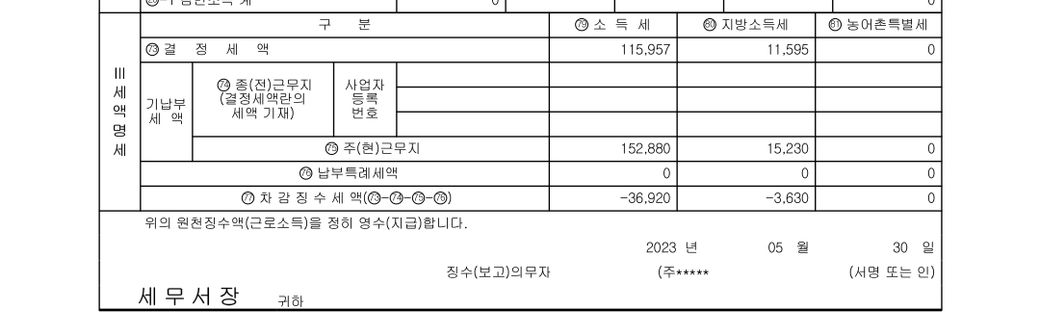 퇴사 시의 원천징수영수증 상 차감징수세액부분은 이미 회사가 세무서로부터 받은 금액입니다.