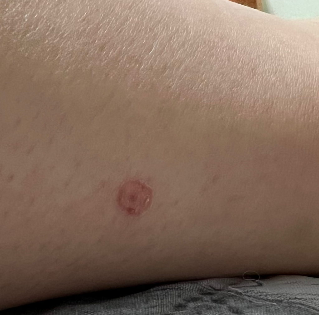 습진성 병변이 보이는데, 접촉성 피부염에 대한 의심도 해보아야 할 것 같습니다. 근처 피부과를 방문해보시기 바랍니다.