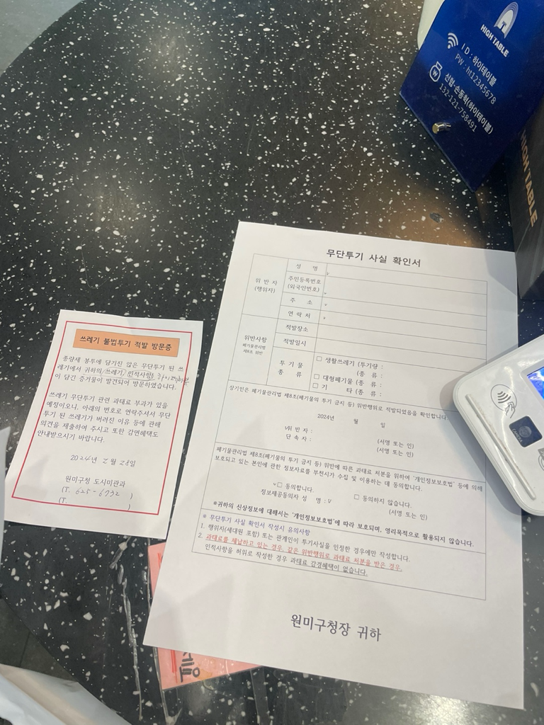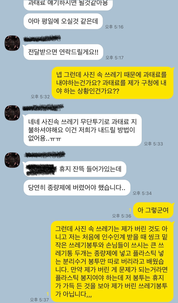 현재 한 카페에서 일을 하고 있는 알바생입니다. 이곳에서 일을 한 지는 이제 막 한 달이 되었고 전에 일하시던 분께이틀간 인수인계를 받고 일을 하고 있습니다. 인수인계를 받으면서 휴대폰 메모장에 마감 순서와 세부사항들을 다 정리를 해두었고 지금까지 인수인계 받은대로 일을 해왔습니다. 방금 매장 사장님께서 쓰레기 사진과 함께 제게 무딘투기 사실 확인서를 작성하고 20만원이 넘는 과태료를 제게 내라고 하시는 상황입니다. 자는 인수인계를 받을 때 플라스틱이 든 분리수거 봉투는 종량제봉투가 아닌 일반 비닐봉투에 담아 버리는 것이라고 배웠고 그외 나머지 쓰레기들은 종량제봉투에 한데 모아 버려왔습니다. 사진 속 쓰레기 봉투는 제가 버린 게 아닌 게 분명한데 이 경우에도 제가 과태료를 내고 구청직원과 얘기를 해야하는 건가요? 답뱐주시면 정말 감사하겠습니다.