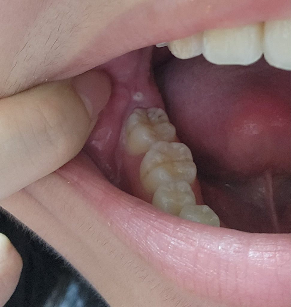 위의 사랑니가 아래로 내려와서 아래 잇몸을 누르게 된다면 해당 사진과 같이 하얀색으로 보이는 형태를 띨 수 있습니다. 이런 경우에는 내려온 사랑니를 발치하거나 잇몸을 자극하는 부위를 다듬어 줘야 할 수 있습니다. 자세한 확인을 위해서 치과에서 진료를 받아보세요