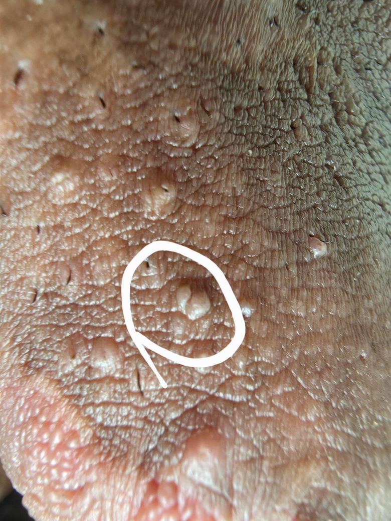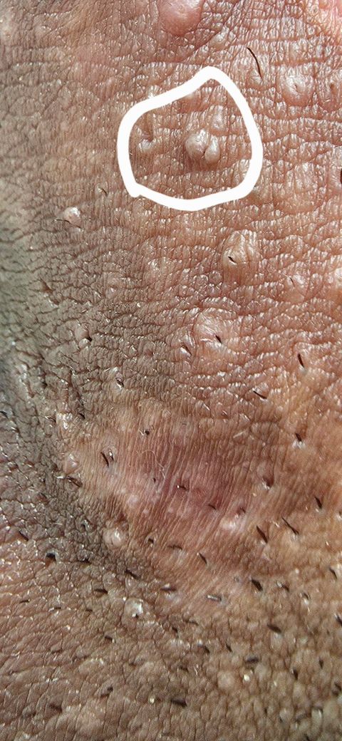 오히려 현재 소견은 모낭과 관련된 병변, 즉 면포나 모낭성 구진, 또는 피지선이 도드라져 보이는 경우와 더 유사합니다. 특히 면도 부위로 보이고, 털이 자라는 방향과 함께 작은 구진들이 분포하는 점에서 모낭 자극이나 면도 후 변화 가능성이 높습니다. 일부는 모낭염 초기나 인그로운 헤어(매몰모) 형태로도 해석 가능합니다.