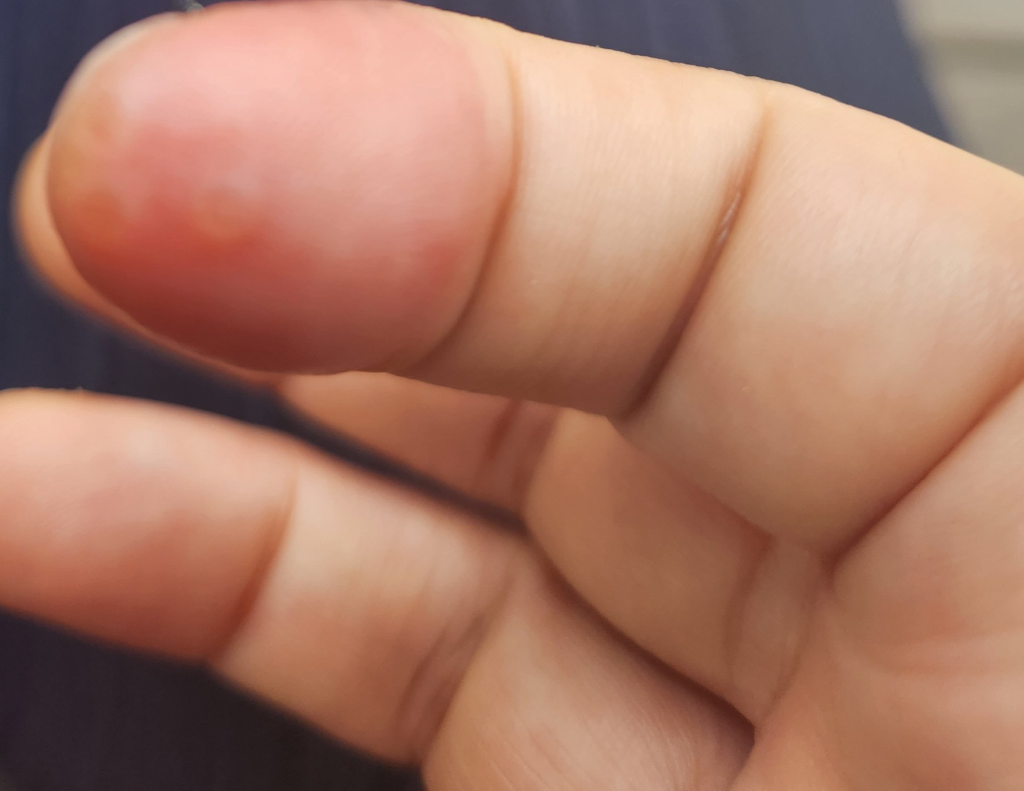 한포진의 가능성이 있어 보입니다.한포진은 급성기에 휴식을 취하며 병변 부위에 국소 스테로이드 연고를 바르면서 치료합니다. 상태에 따라서 습포제, 광선 치료 등이 도움이 되기도 합니다.