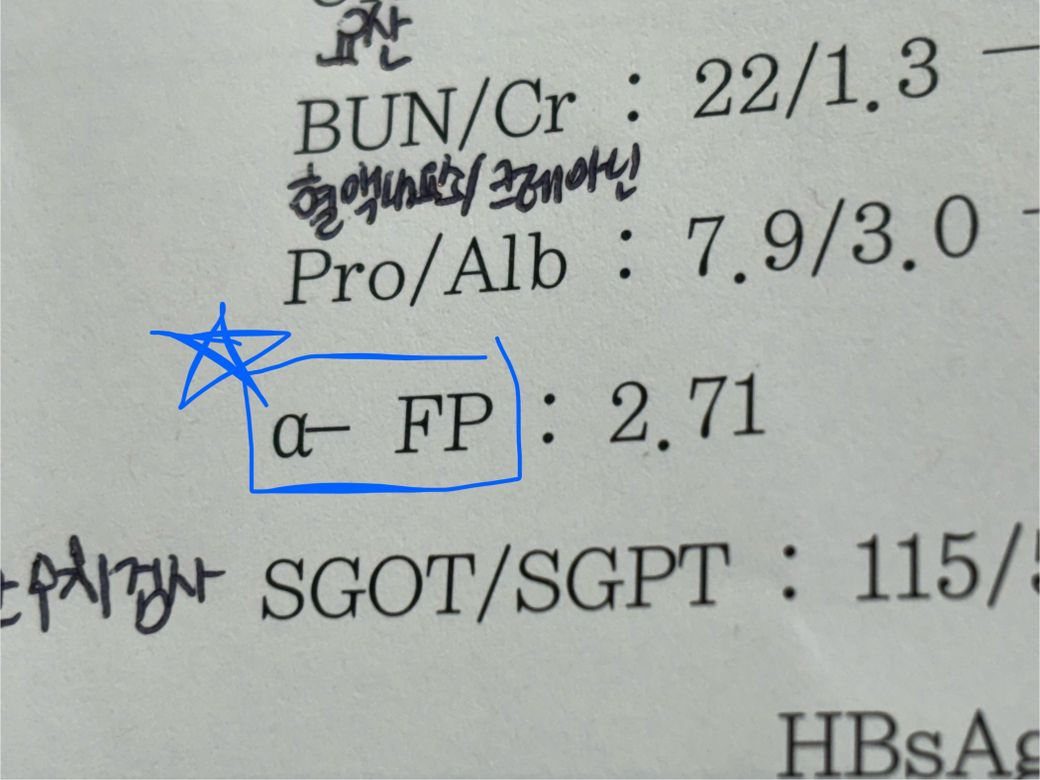 질문자님께서 첨부해주신 사진의 a-FP은 아마도 alpha fetoprotein을 의미하는 것 같습니다. 기관에 따라 다를 수 있지만 0~10ng/mL 정도를 정상치로 보는 편이며, 간암의 종양 표지자로 활용되고 있는 수치입니다.