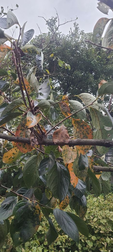 감나무의 잎에 검고 둥근 반점이 생겨나 점점커져서 잎이 빨리 떨어지게 됩니다.