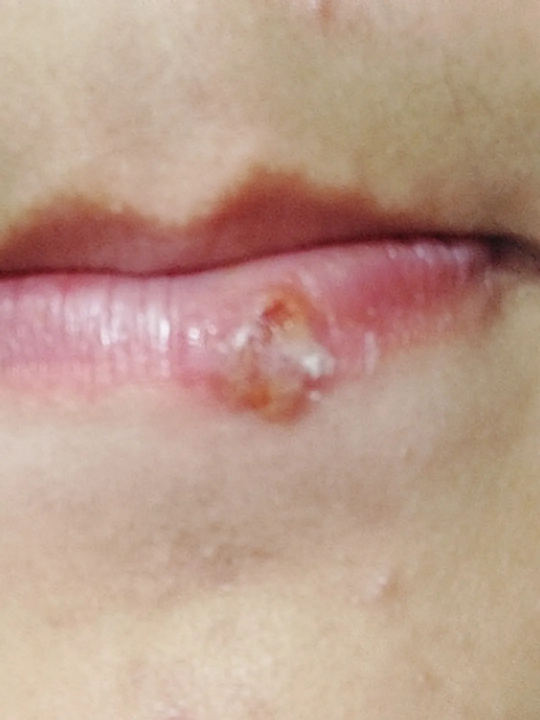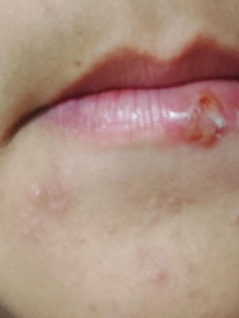 1형 헤르페스로 처음에는 수포가 올라오면서 나중에는 터져서 2차 세균감염으로 이어질 수 있씁니다.
