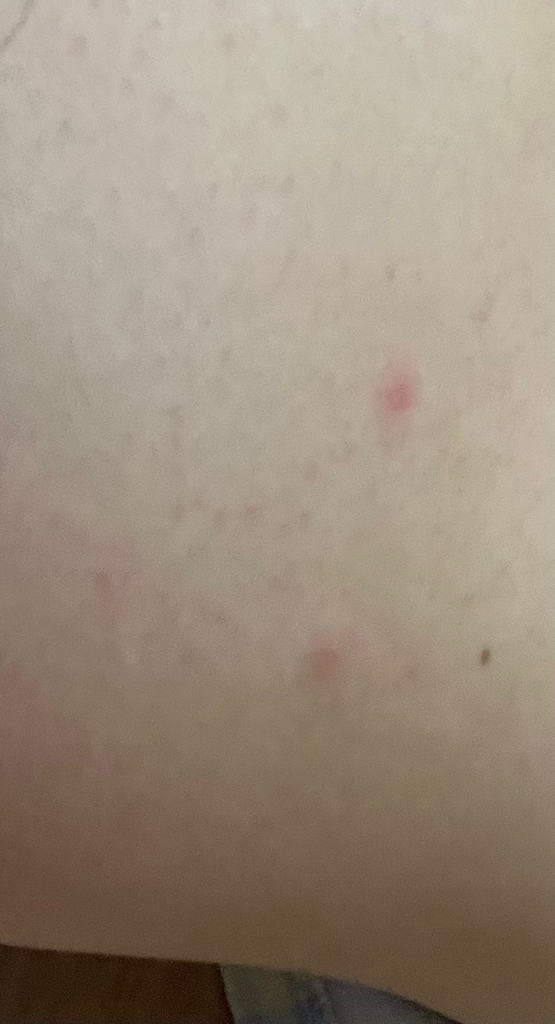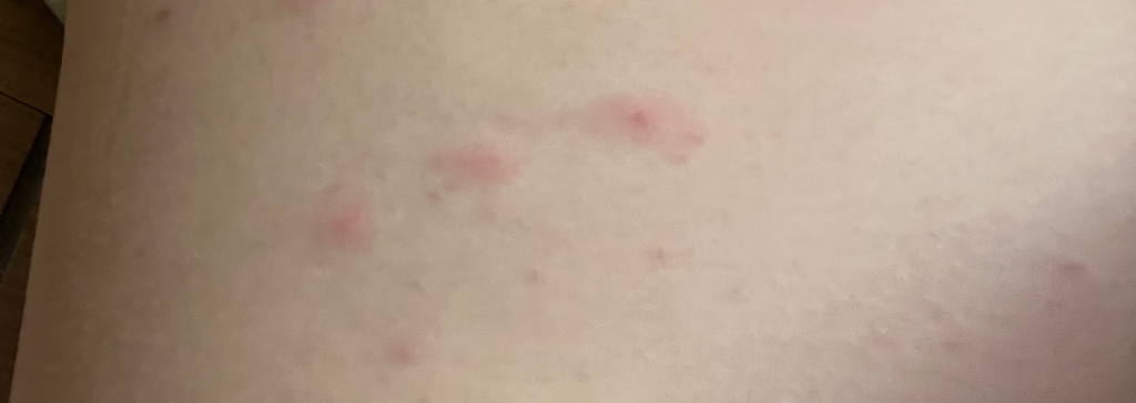 두드러기성 병변이 보이는 것으로 생각되고 가려움증이 없으니 며칠 기다려보실 수 있겠습니다. 사라지지 않는다면 가까운 피부과를 방문해 스테로이드 연고를 사용해볼 수도 있겠다는 생각이 듭니다.