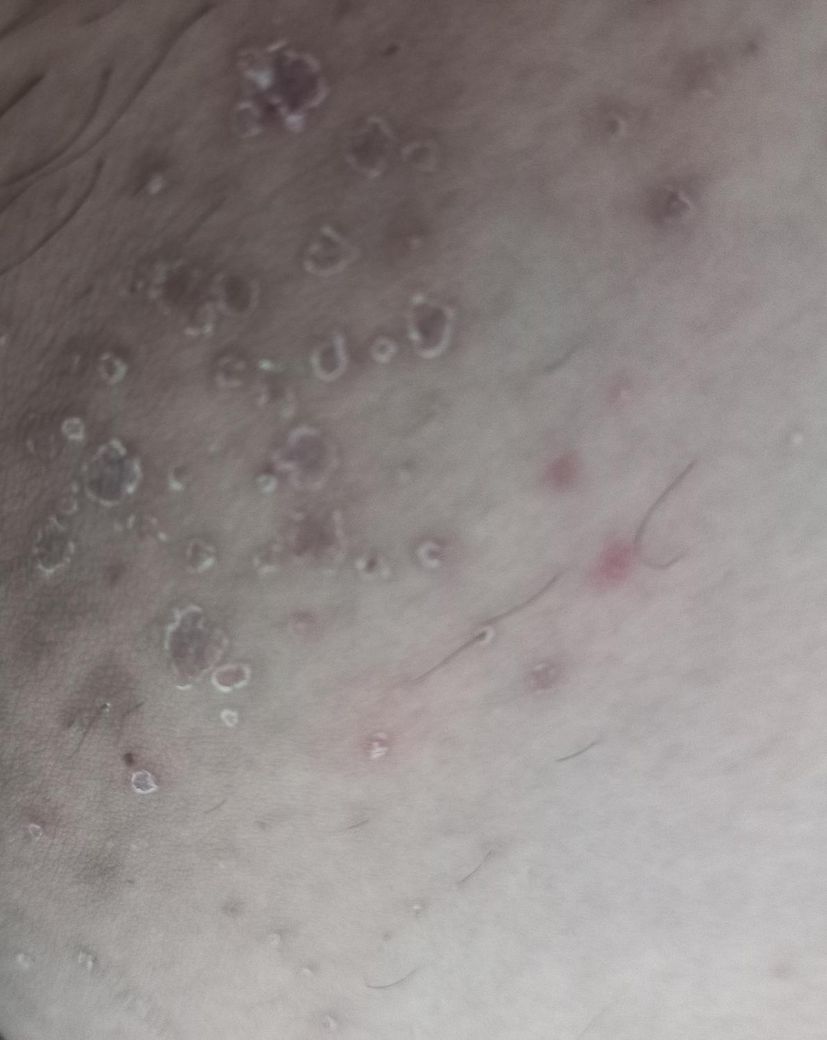 원래 병변을 확인하지 못하기 때문에 (그게 뭐였던 지금 터져서? 딱지가 생긴 상태로 보여요) 정확하게 뭔지 확인은 어려울 듯 합니다. 좁쌀 여드름 처럼 보였어도 수포였을수도 있어요