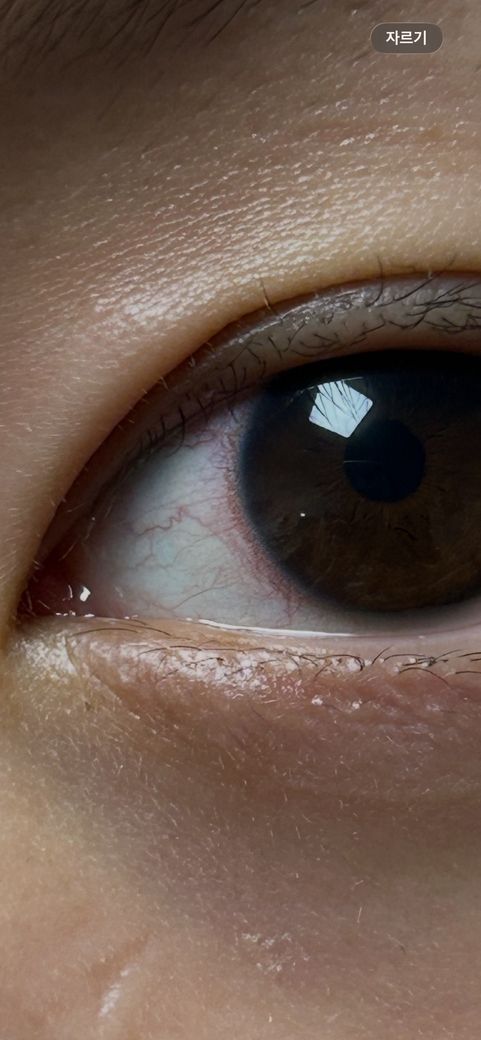사진상 결막 충혈이 경미하게 보이고 각막 표면이 다소 건조해 보이는 소견이며, 뚜렷한 출혈이나 급성 염증을 시사하는 소견은 관찰되지 않습니다. 말씀하신 것처럼 피곤할 때만 반복되고 뿌옇게 보이면서 건조감이 동반되는 양상은 가장 흔하게 안구건조증에서 나타나는 형태로, 수면 부족이나 장시간 근거리 작업 시 눈물막이 불안정해지면서 일시적인 시야 흐림과 충혈이 발생할 수 있습니다.