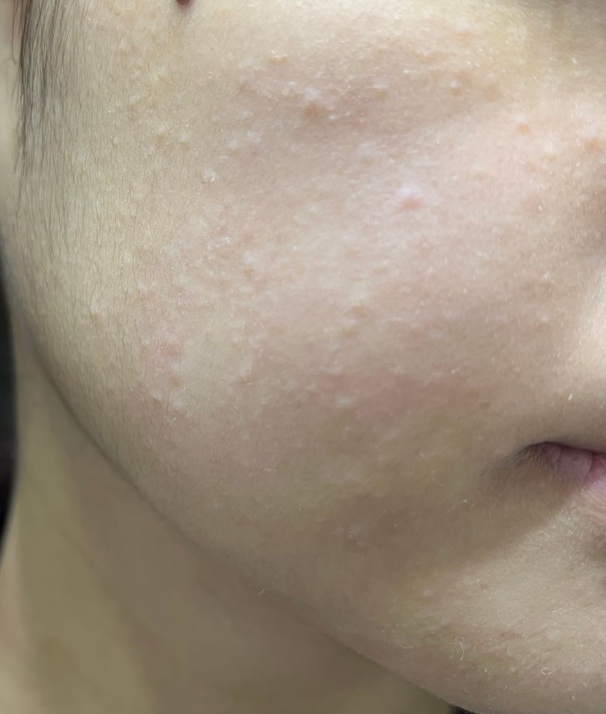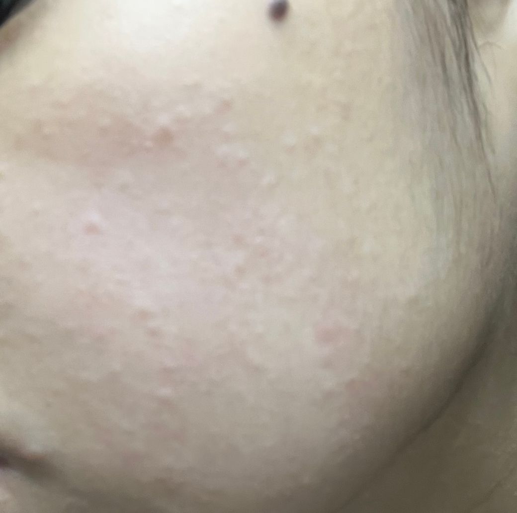 육안으로 관찰하였을 시 화이트헤드(좁쌀 여드름) 등의 가능성도 있겠지만, 급격한 시기에 확 발생하여 나빠진 것이라면 알레르기 반응 등으로 인한 구진들 또한 감별해야 할 것으로 보입니다.