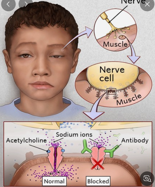 치료는 위에서 이야기한 방해받고있는 전기 신호를 다시 촉진할 항아세틸콜린에스터레이즈(항AChE)의 투여, 면역요법, 가슴샘절제술, 혈장분리교환술, 면역글로불린 정맥주사 같은 방법들이 잇습니다. 뒤에 치료들은 전기 신호의 전달을 방해하는 항체가 생기는게 자가면역 때문인데 이 자가면역 항체가 만들어지는걸 개선하는 치료방법들입니다.