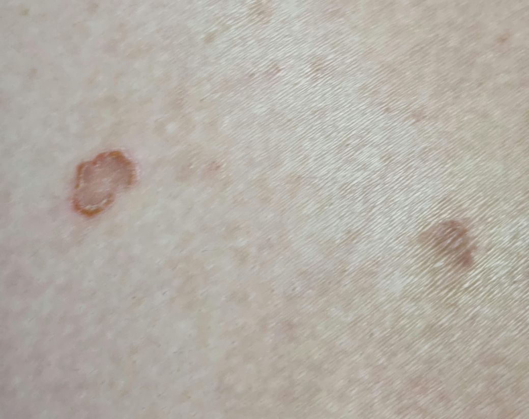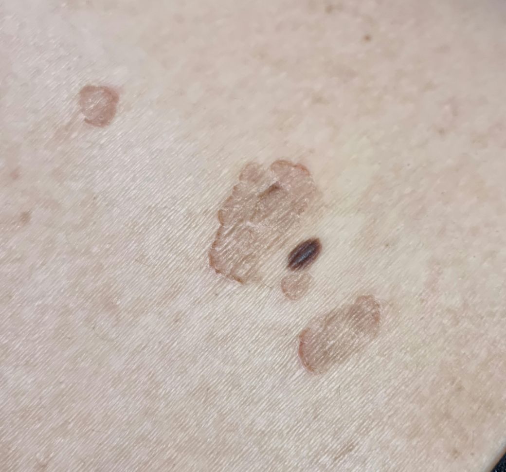 여러가지 가능성이 있습니다. 지루성 각화증과 같은 양성 병변은 갈색이나 검은색으로 나타나며 표면이 거칠거나 왁스처럼 보일 수 있고, 색소성 반점은 자외선 노출로 인한 전암성 병변으로 거칠고 불규칙한 형태를 띨 수 있습니다. 그 외에도 피지선 낭종 등의 양성종양도 가능성 있구요, 흑색종 등의 피부암도 검사 통해서 배제 하셔야 합니다.