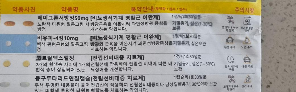 전립선비대로 약을받았는데 4가지약중 베미그론서방정만 아침 1알, 나머지 3가지약 저녁 이렇게 복용지도 받았습니다
